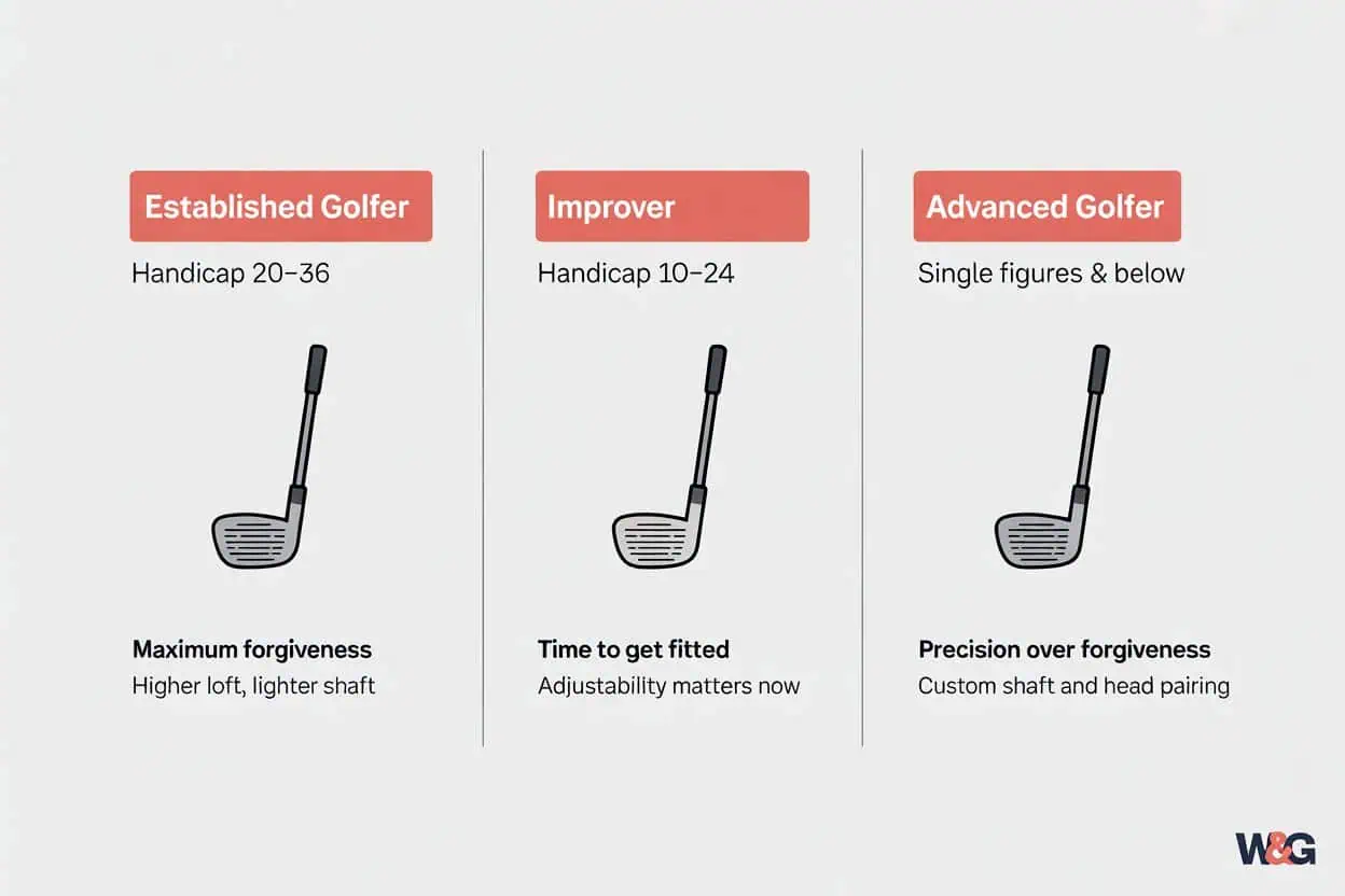 The Improver (handicap 10–24) — You’re generating more speed now and your strike is becoming more consistent. This is a great time to get fitted properly, because you’re changing fast. You might find you need a slightly stiffer shaft or a touch less loft than when you started. Adjustability becomes more useful here, because you can adapt the club as your swing develops rather than replacing it.