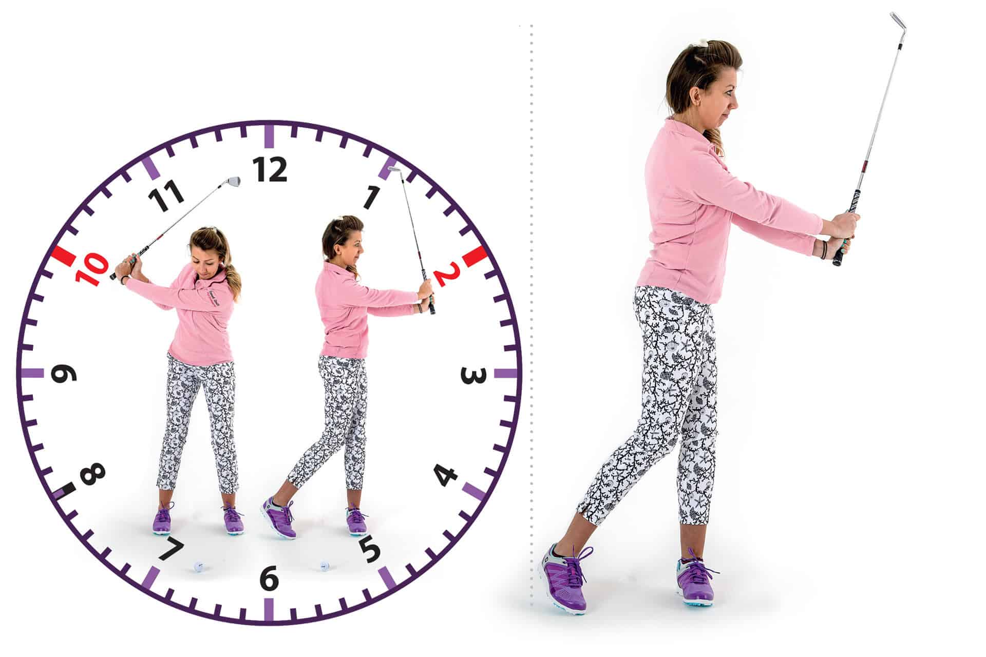 A good way to learn how to cover all yardages with your pitching wedge is by thinking of a clock face. The clubhead should point at each opposite hour on the clock to create equal length back and through swings. For example, 10 to 2 or 11 to 1 would be good for a longer pitch shot.