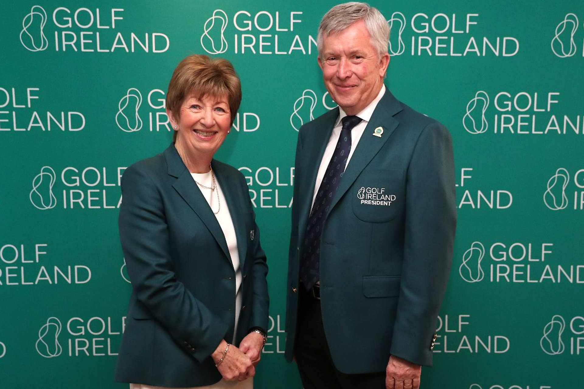Kay O’Loughlin became the first female President of Golf Ireland. The Castlerea GC member succeeded the outgoing John White (Co. Armagh GC) to become President (both pictured above).