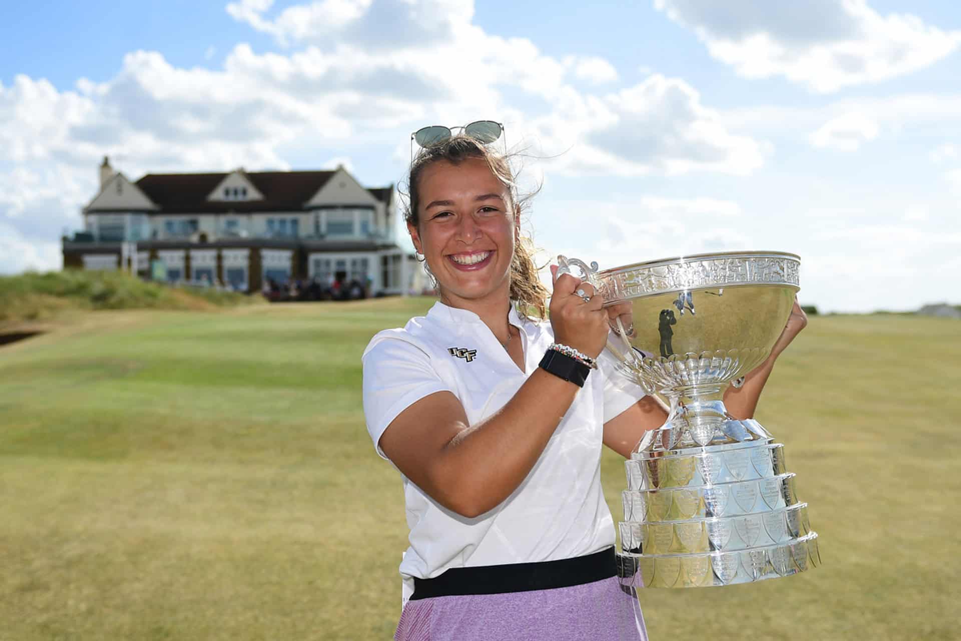 The Englishwoman, 19, shone in the sun over the Norfolk links to achieve a 4&3 success against Sweden’s Louise Rydqvist, 20, in the 36-hole Final.