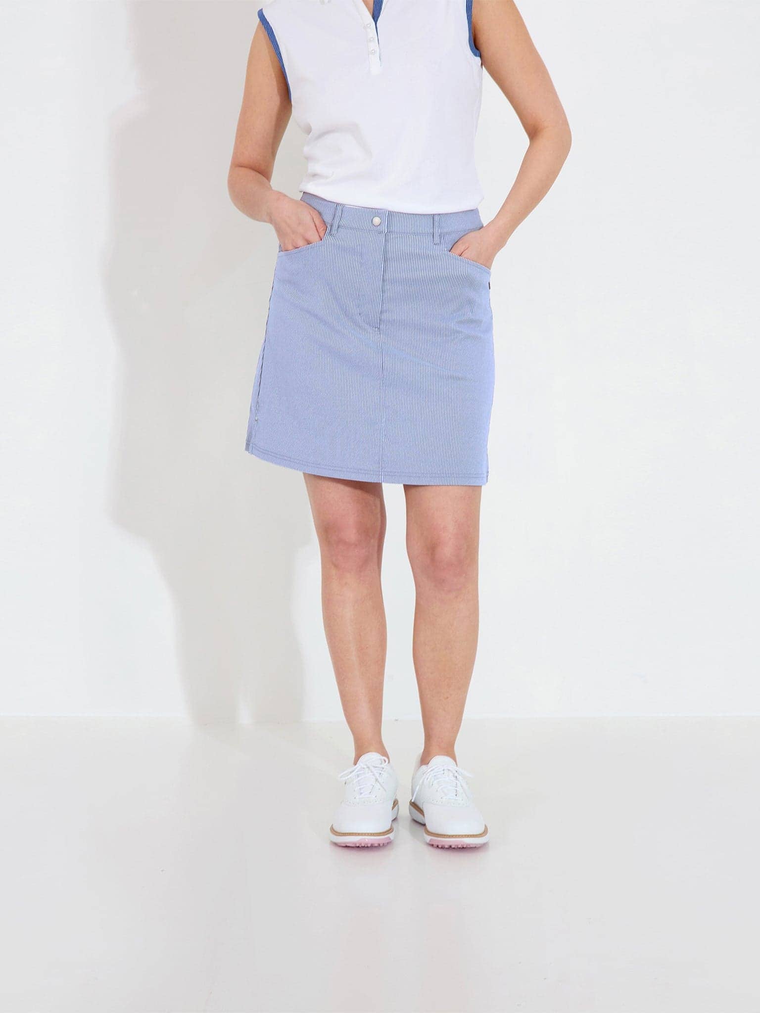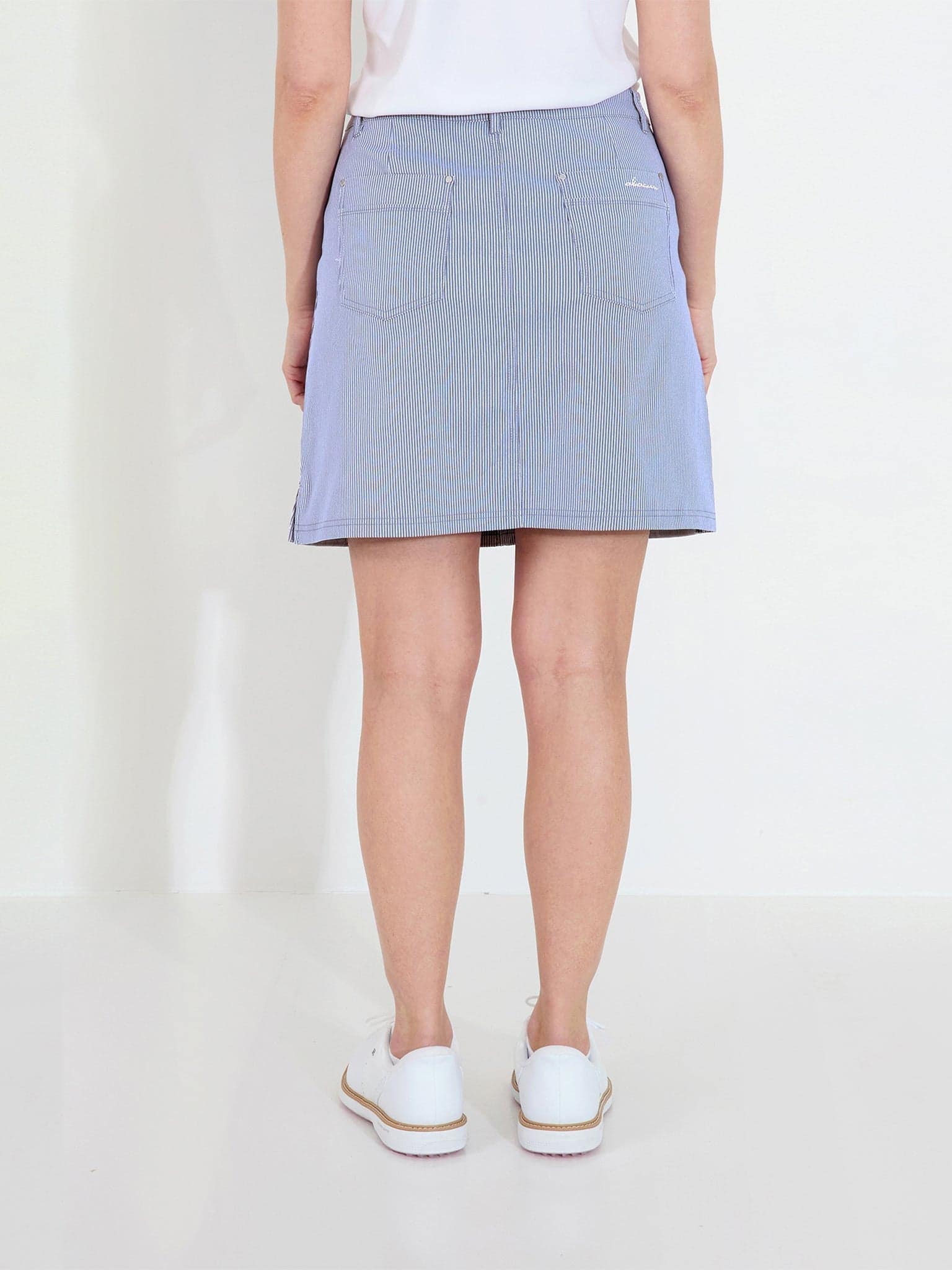 This pinstripe skort delivers the polished look of denim with technical performance built in. The stretchy fabric moves naturally with your body while keeping you cool and dry. Perfect for golf or any active day when you need to look put-together.