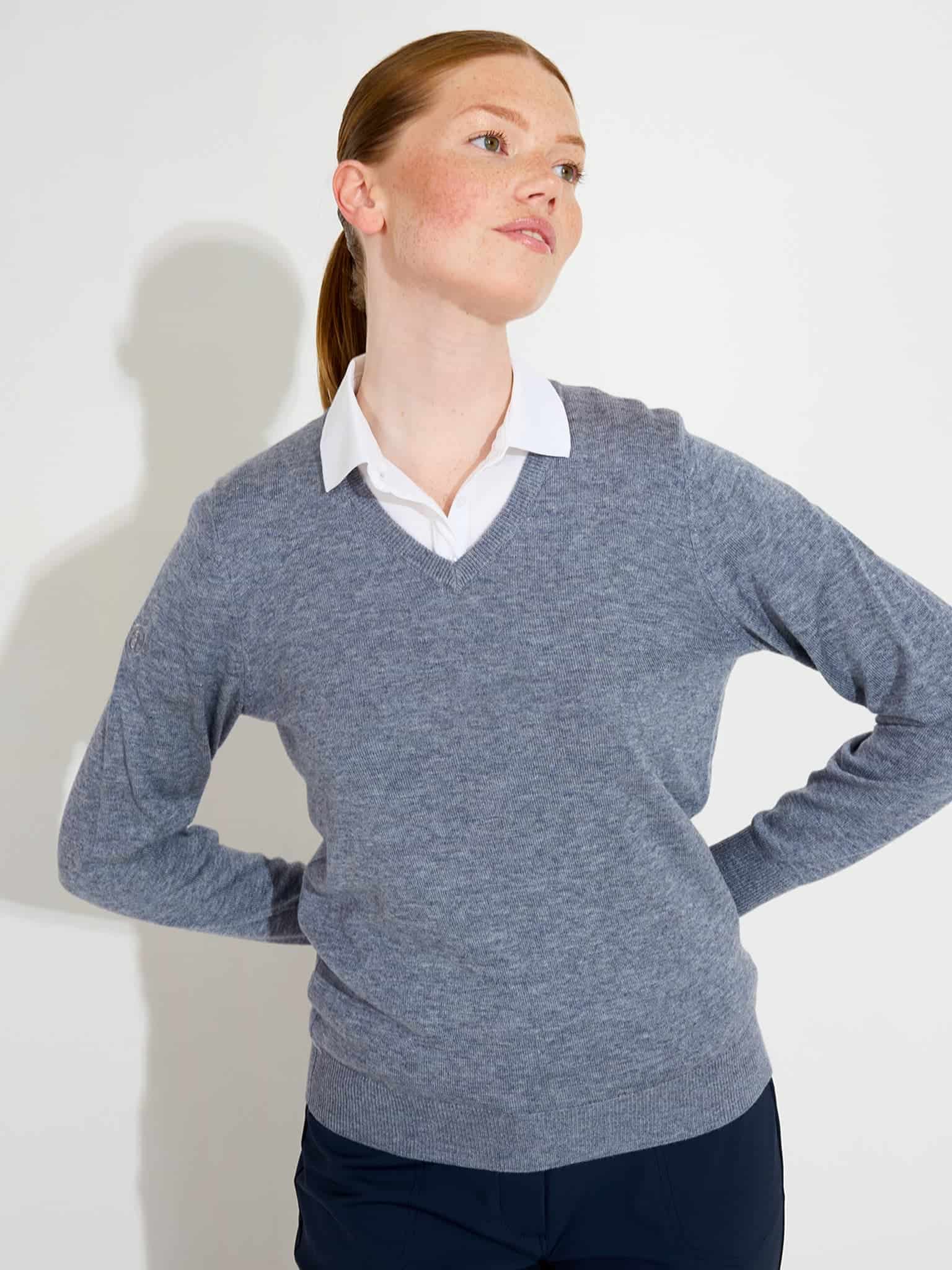 This fine-gauge V-neck sweater bridges golf tradition with everyday versatility. The soft blend moves with you through your swing and transitions seamlessly from course to clubhouse. A classic piece that works with your existing wardrobe.