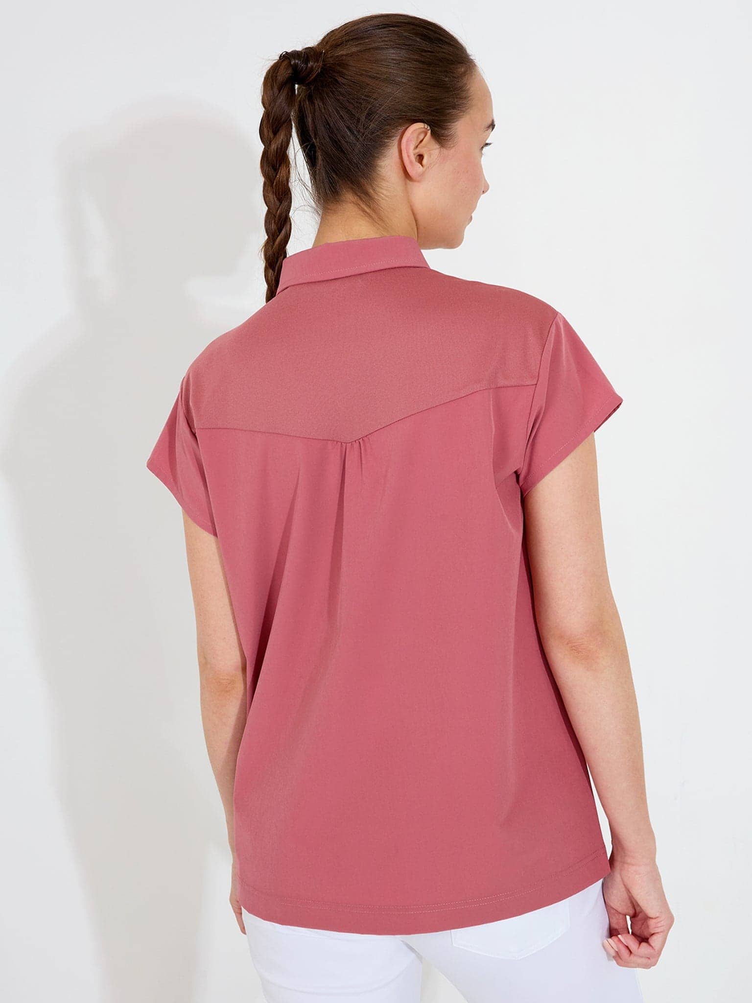 This lightweight top handles hot days on the golf course with breathable fabric and strategic stretch placement. The loose fit allows air to circulate while maintaining a clean, minimal appearance. A single button closure with rhinestone detail adds a subtle finishing touch.