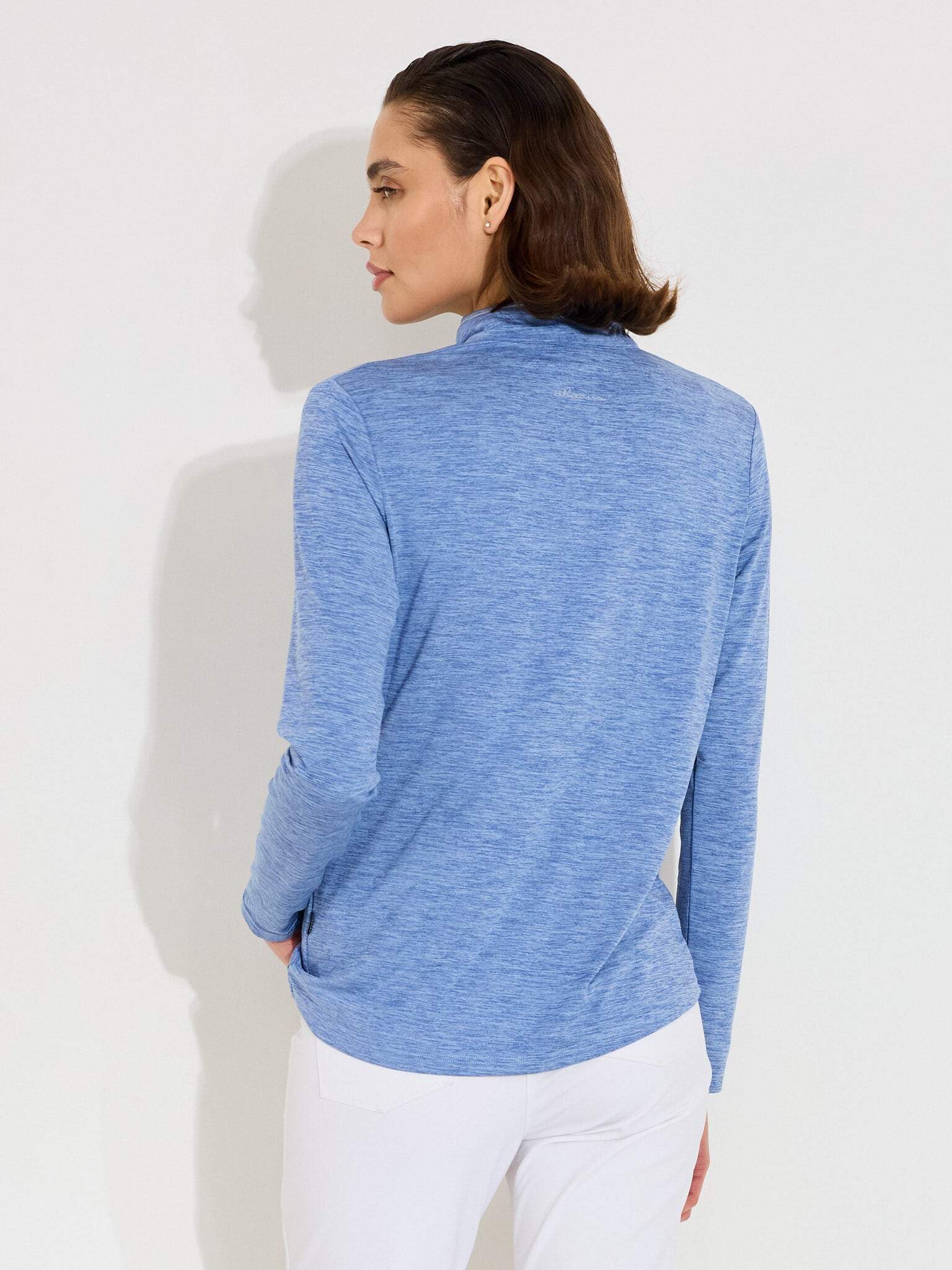 This longsleeve top combines feminine styling with athletic functionality for active wear. The soft, flexible fabric moves with your body while managing heat and moisture. The higher neckline and rounded collar provide comfort and coverage during movement.