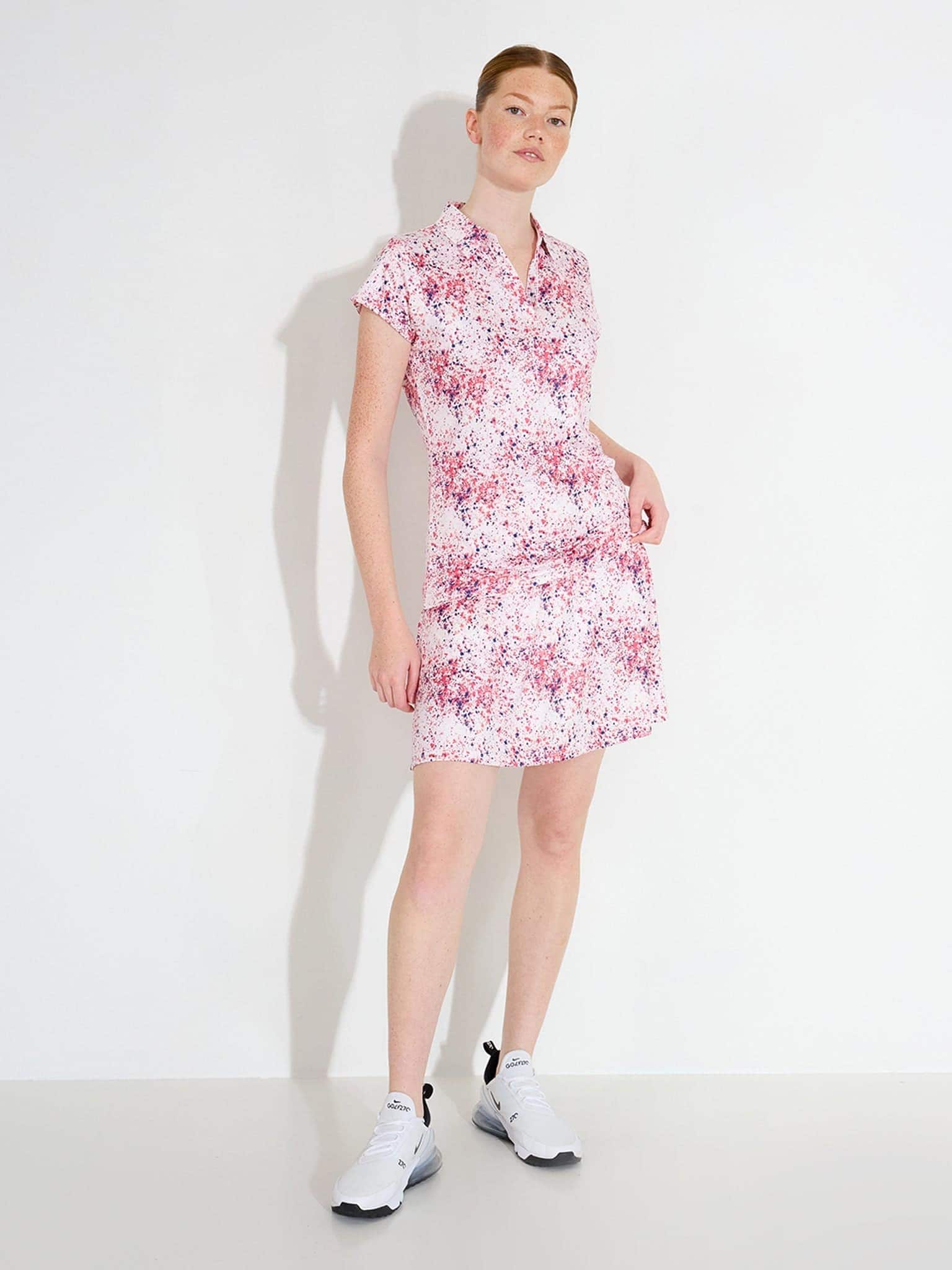 This cupsleeve top features an all-over pattern and buttonless V-neck design. The stretchy recycled polyester fabric includes moisture-wicking technology for comfortable wear throughout the day.