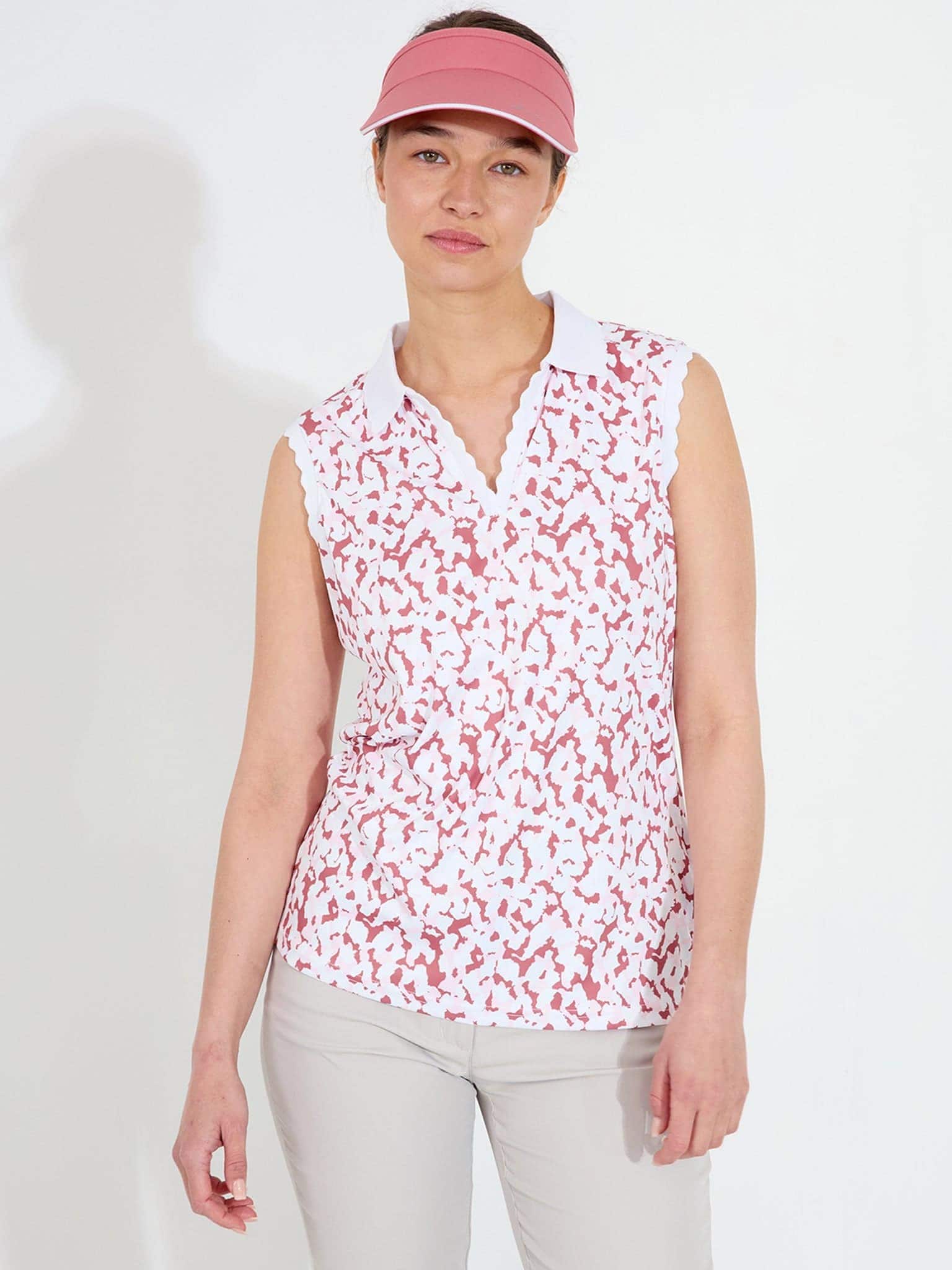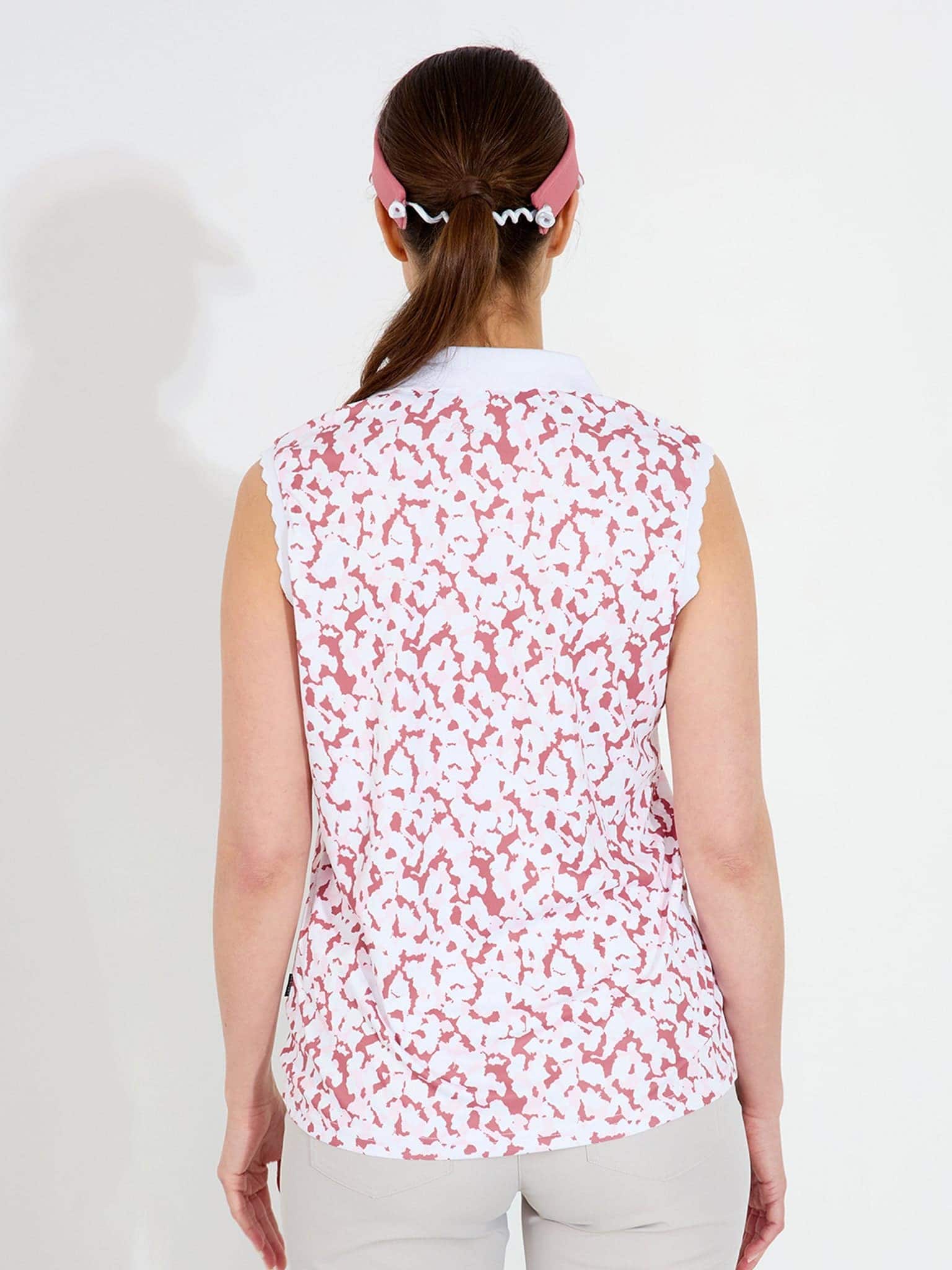 This sleeveless golf top delivers cooling comfort and unrestricted movement for warm weather rounds. Made from soft, stretchy recycled polyester, it wicks moisture away while providing built-in sun protection. The feminine design features a clean v-neckline and curved shoulder edges.