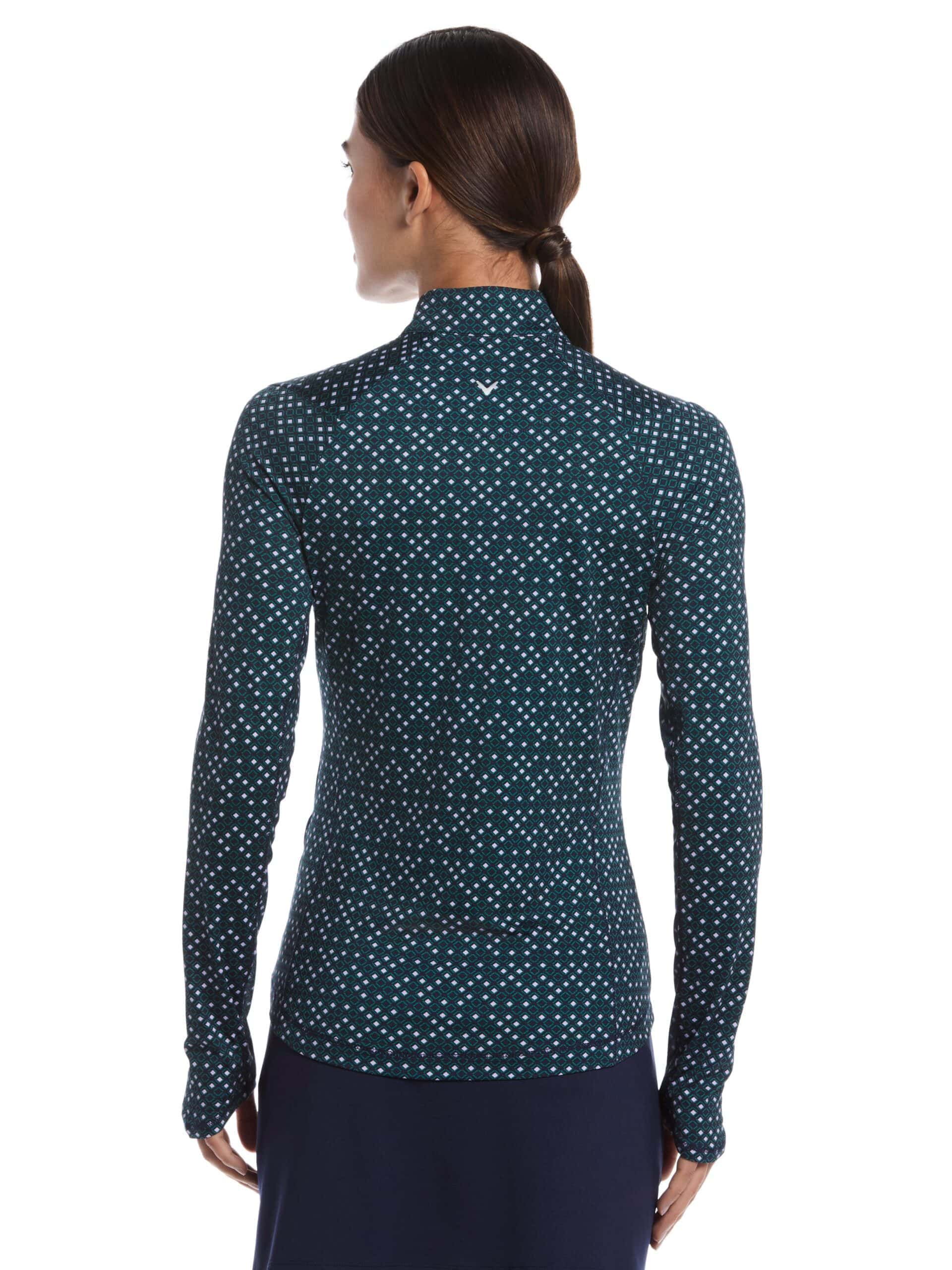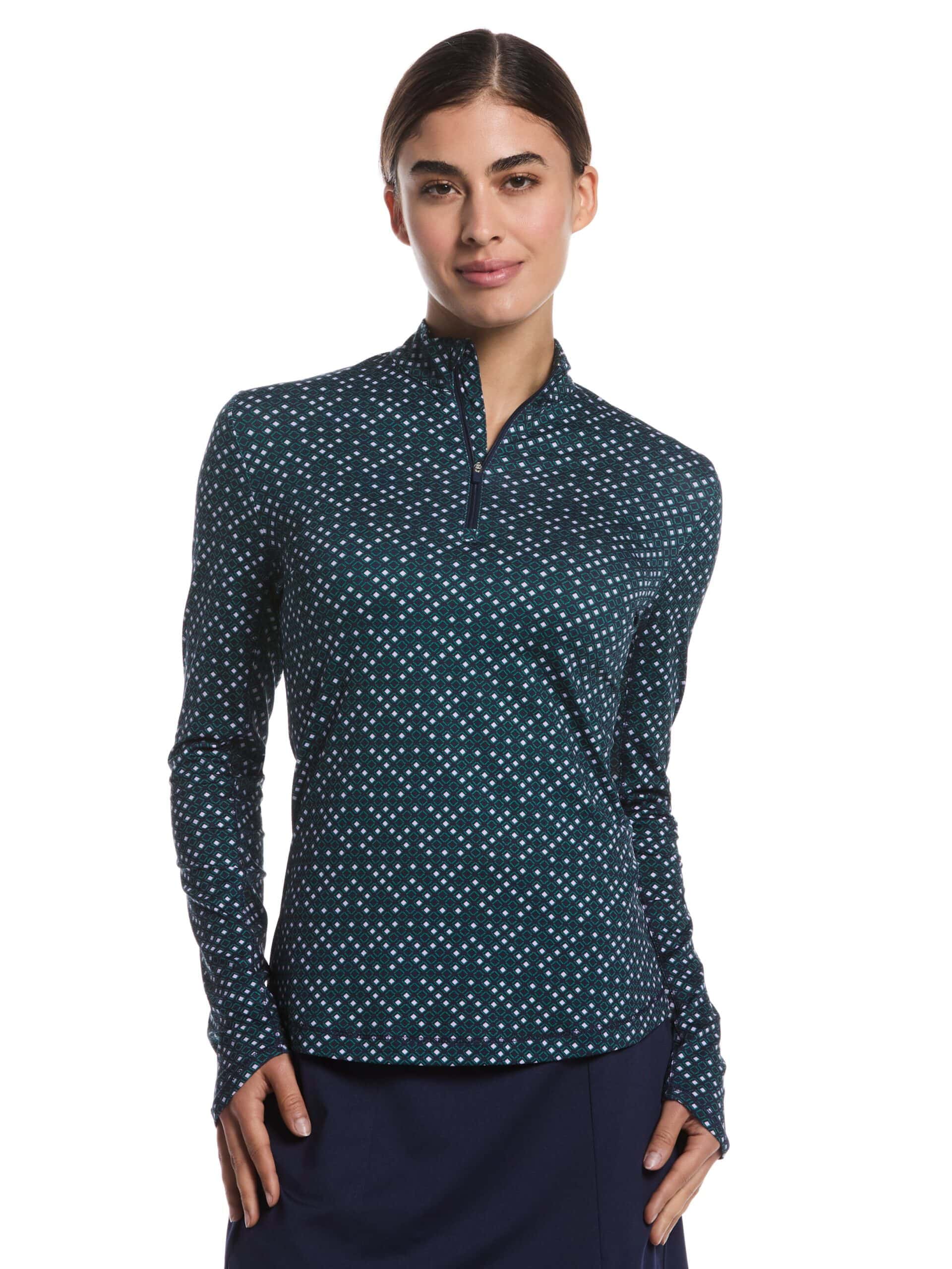 This long sleeve golf shirt combines performance features with a modern geometric print design. The textured stretch fabric moves with your body during play while maintaining its shape. The mock neck collar provides additional coverage without restricting movement.