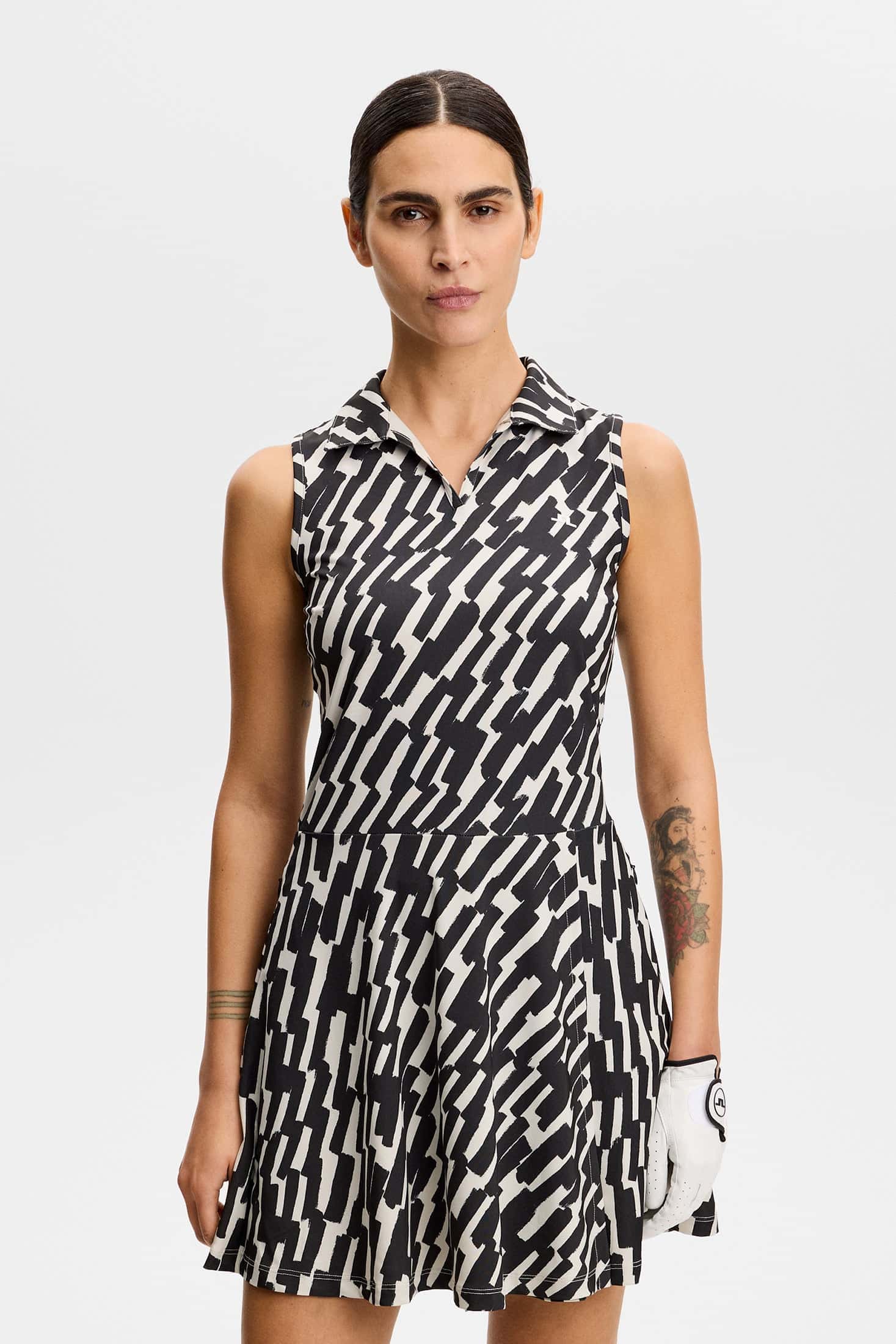 The Dana Printed Dress combines technical performance with bold seasonal styling. The stretch fabric construction ensures comfort during movement while maintaining a refined silhouette. Built-in shorts offer practical coverage for active wear.