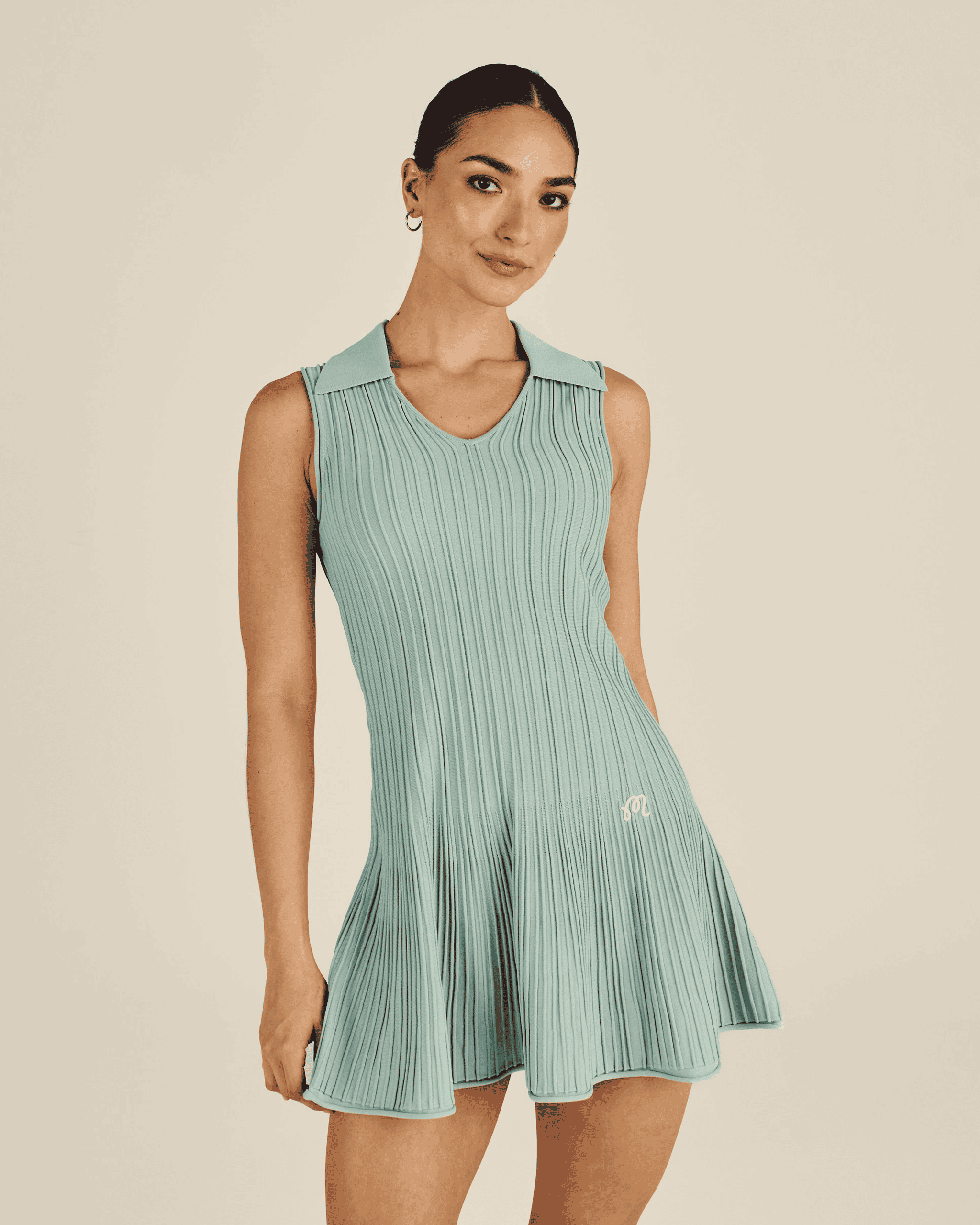 This sleeveless knit dress combines structured tailoring with feminine movement. The fitted bodice flows into a pleated skirt that moves naturally as you walk. Built-in shorts provide coverage and confidence underneath.