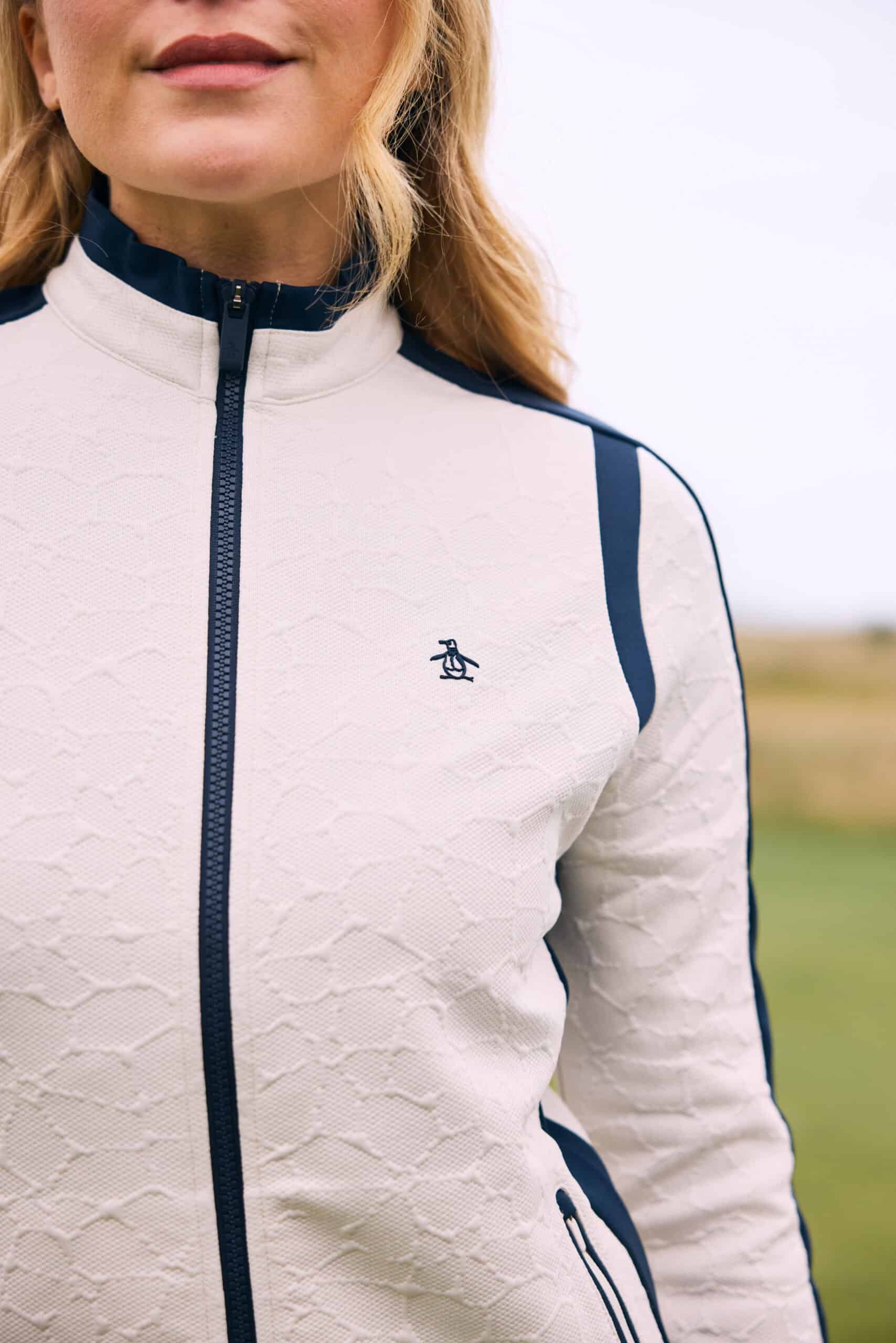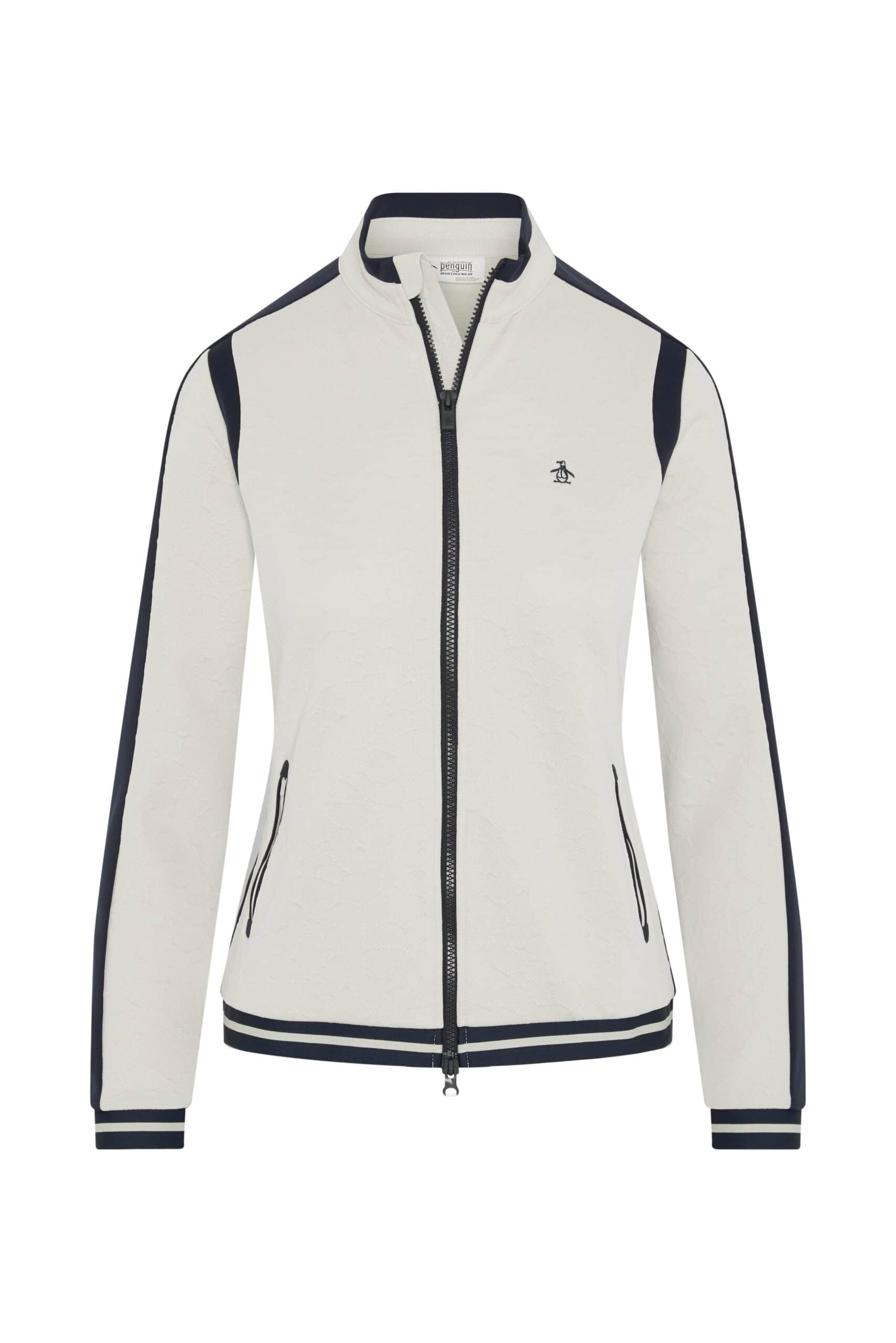 Crafted from a stretchy double knit jacquard fabric with a classic mock neck and a standout colour block design, this jacket is enhanced with moisture-wicking properties to help you stay dry and comfortable during the cooler months, adding a vibrant, floral infused flair to your winter wardrobe.