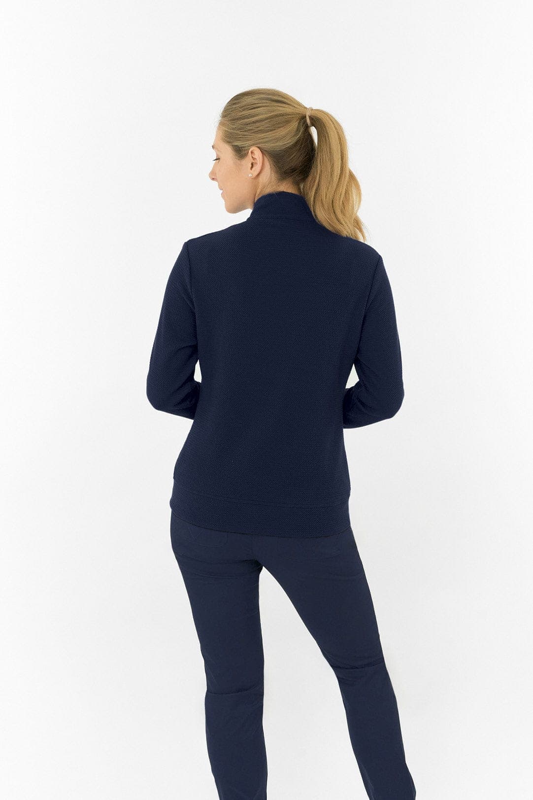 This navy jacket moves easily from golf course to casual wear with its lightweight construction and soft waffle-textured fabric. The breathable design keeps you comfortable in warmer weather while allowing for layering when needed.