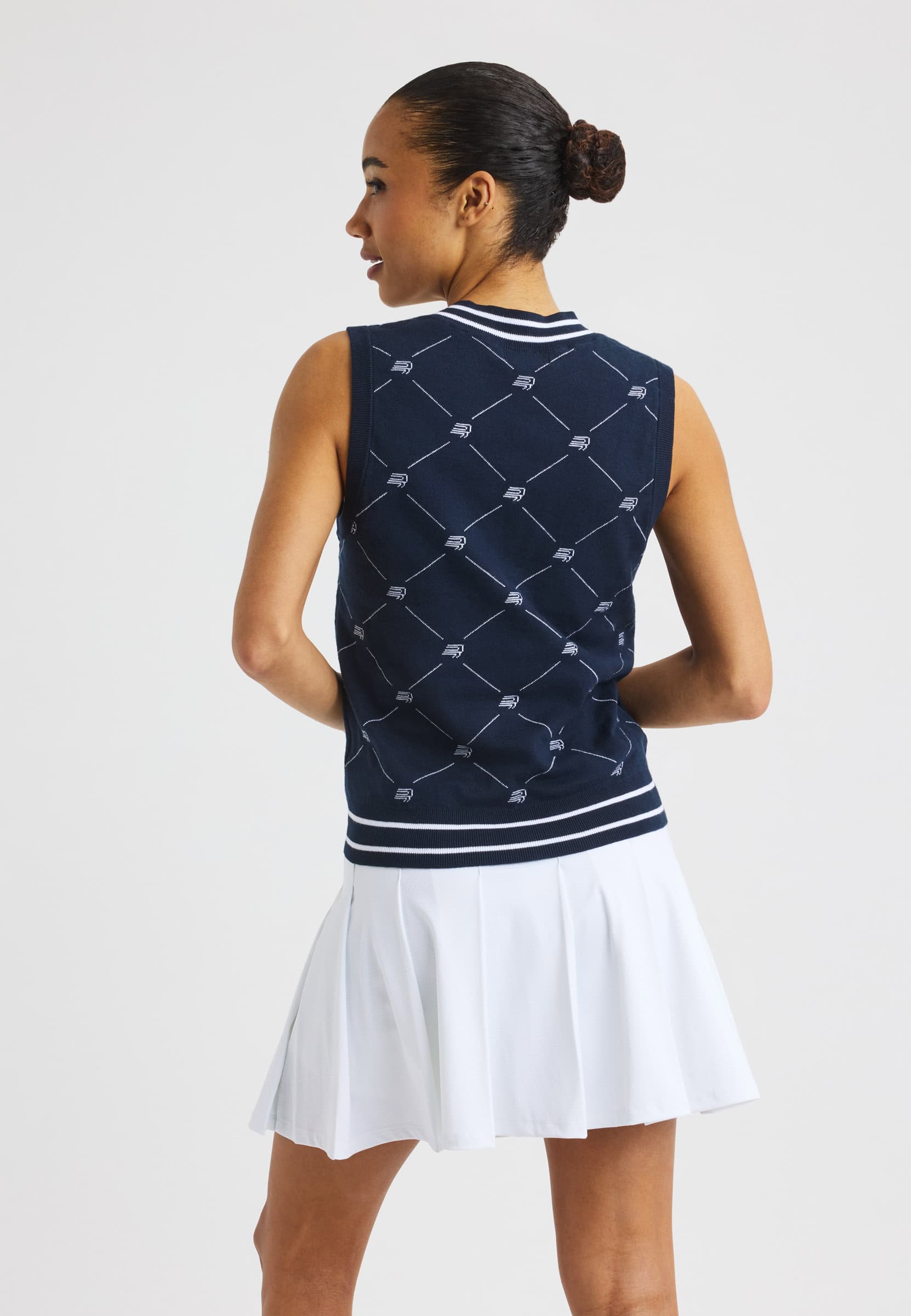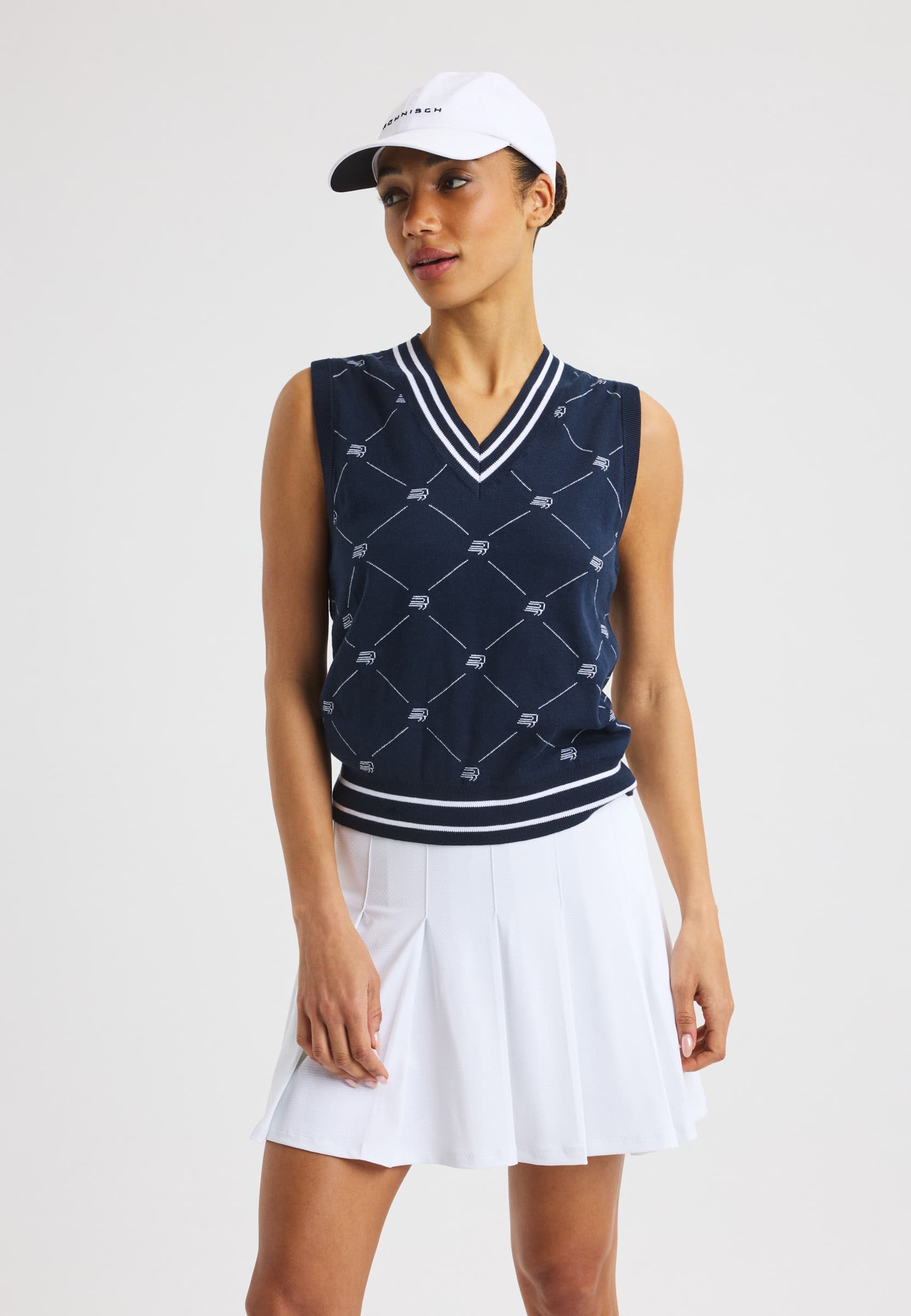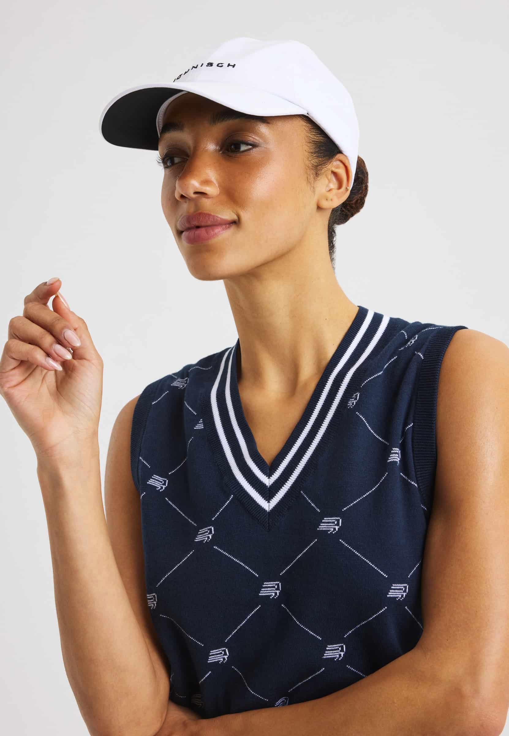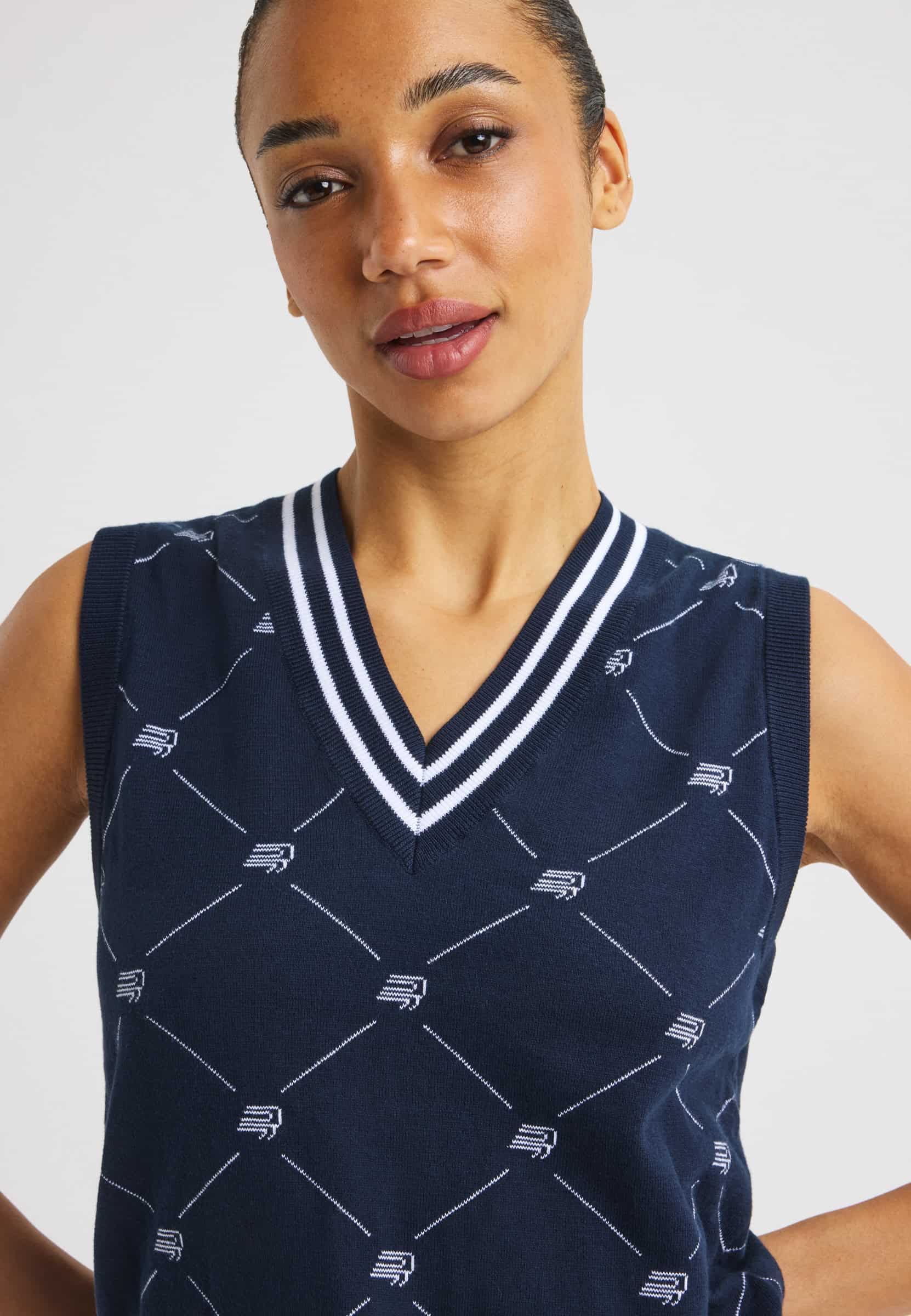 A classic knitted golf vest designed for a timeless, preppy look on and off the course. Made from a soft blend of organic and combed cotton, it offers comfortable wear with a refined finish. Featuring a jacquard-knit Röhnisch pattern and a clean regular fit, this vest is a fully sustainable choice.