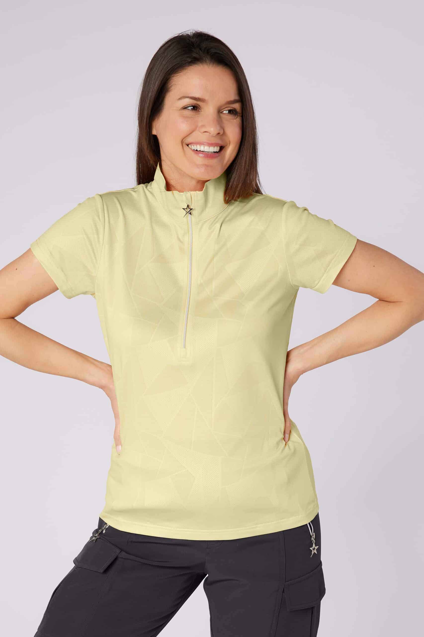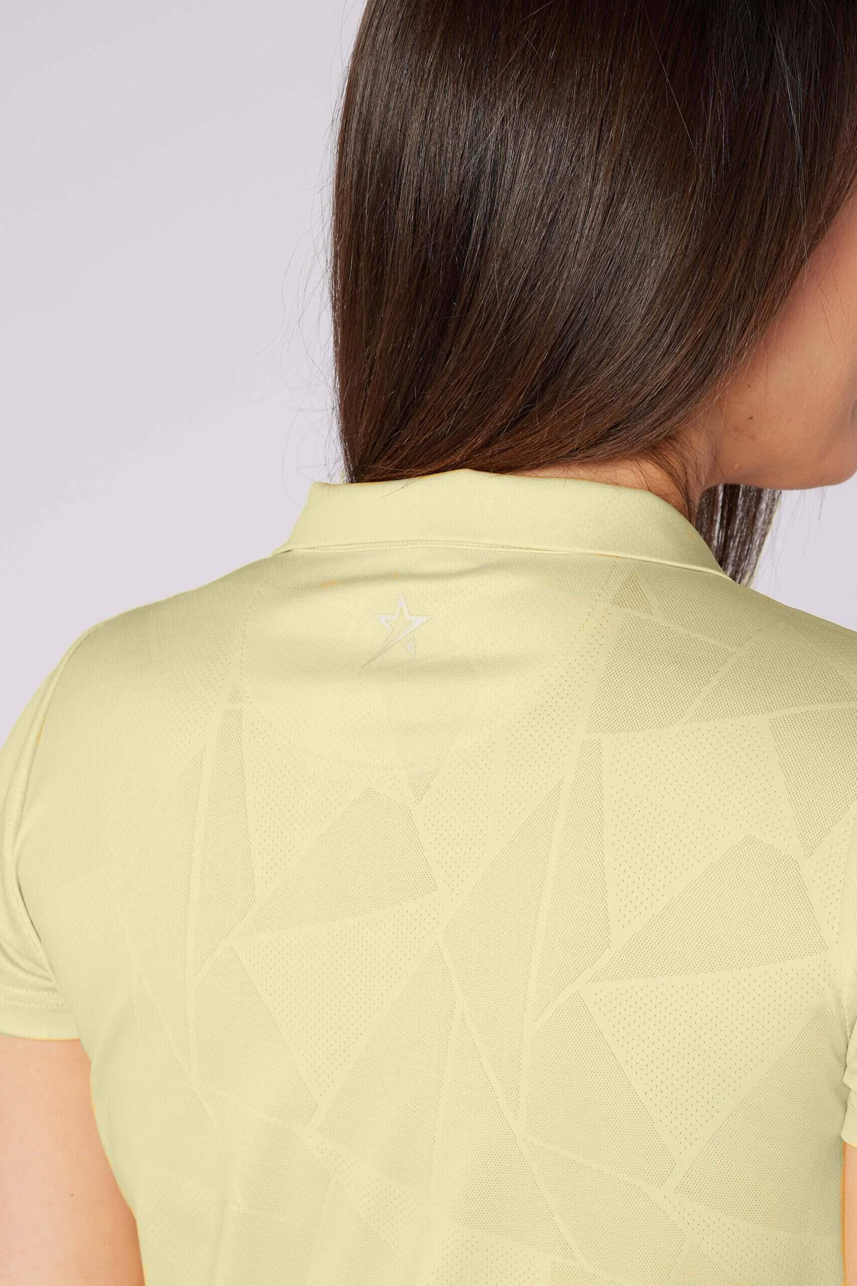 The Mirage Polo offers versatile styling with both cap sleeve and sleeveless options. This plain shirt features a unique embossed pattern that pairs easily with any outfit. The ultra-soft fabric provides comfortable wear against your skin.