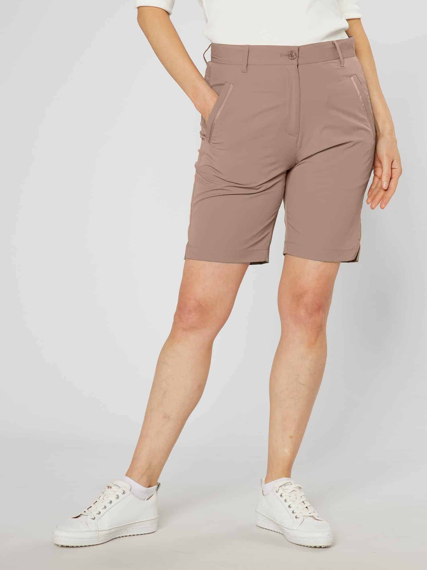 These high-waisted shorts combine lightweight fabric with four-way stretch for all-day comfort. The breathable material moves with you whether you’re on the golf course or transitioning to evening plans.